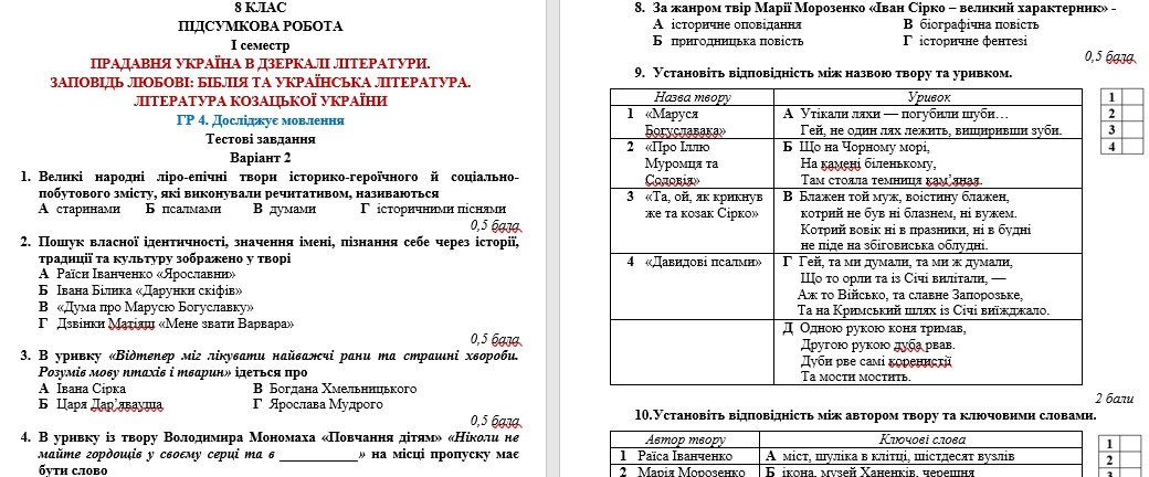 Підсумкова робота відповідає підручнику “Українська література. 8 клас” (автор: Авраменко О. М.).
