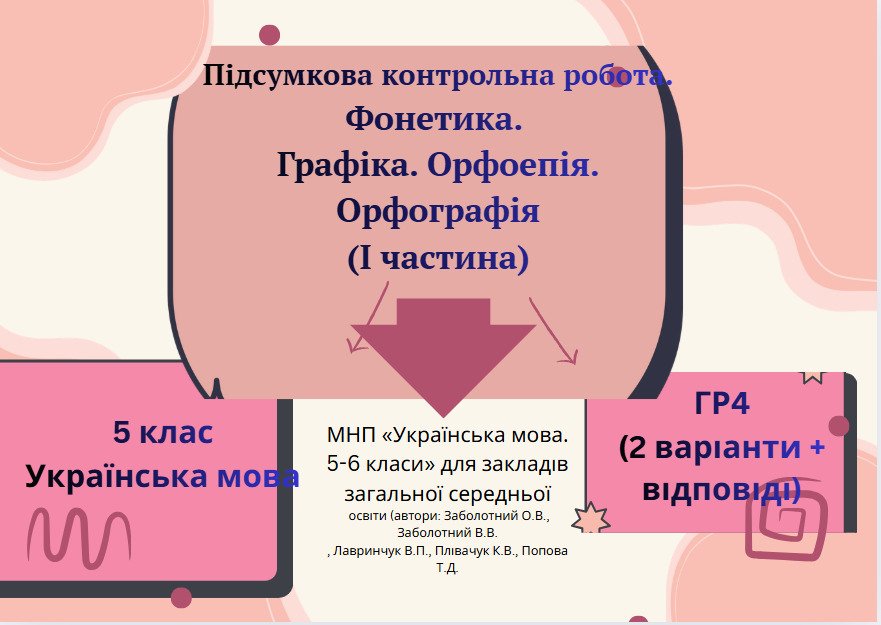 ГР4(2 варіанти + відповіді).Підсумкова робота.Фонетика. Графіка. Орфоепія. Орфографія. (І частина) (5 кл.)Українська мова