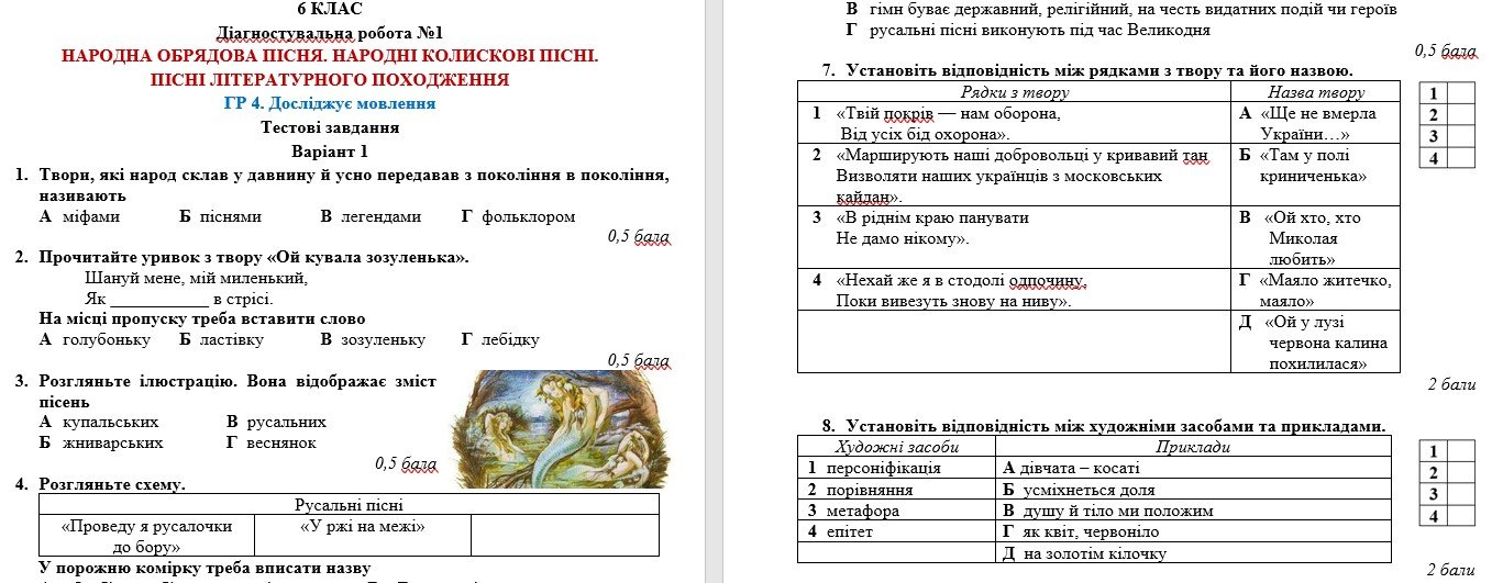 Діагностувальна робота відповідає підручнику “Українська література. 6 клас” (автор: Авраменко О. М.). Може використовуватися для формувального, поточного чи підсумкового оцінювання.