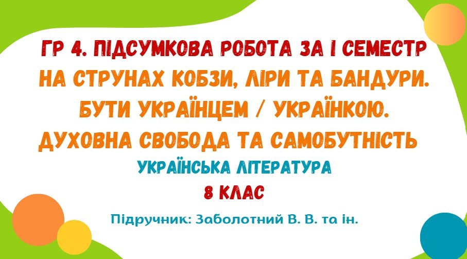 Підсумкова робота за І семестр з української літератури за ГР 4 “Досліджує мовлення” розроблена для учнів 8 класу та охоплює теми “На струнах кобзи, ліри та бандури. Бути українцем / українкою. Духовна свобода та самобутність” (модельна навчальна програма «Українська література. 7–9 класи» для закладів загальної середньої освіти (автори: Заболотний О. В., Слоньовська О. В., Ярмульська І. В.)).