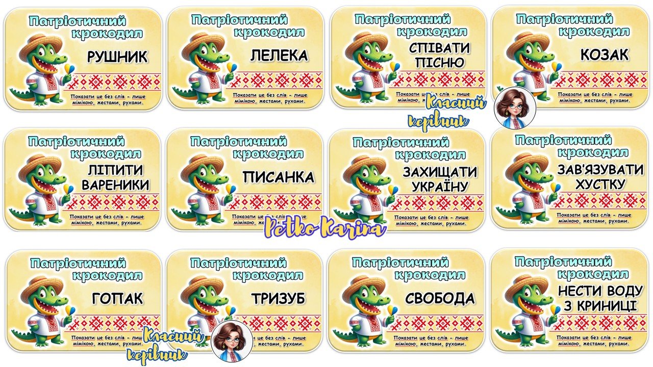Пропоную до вашої уваги гру “Патріотичний крокодил”. Чудова ідея для патріотичних свят та заходів на українську тематику! Всього 72 картки по 4 на аркуш.
