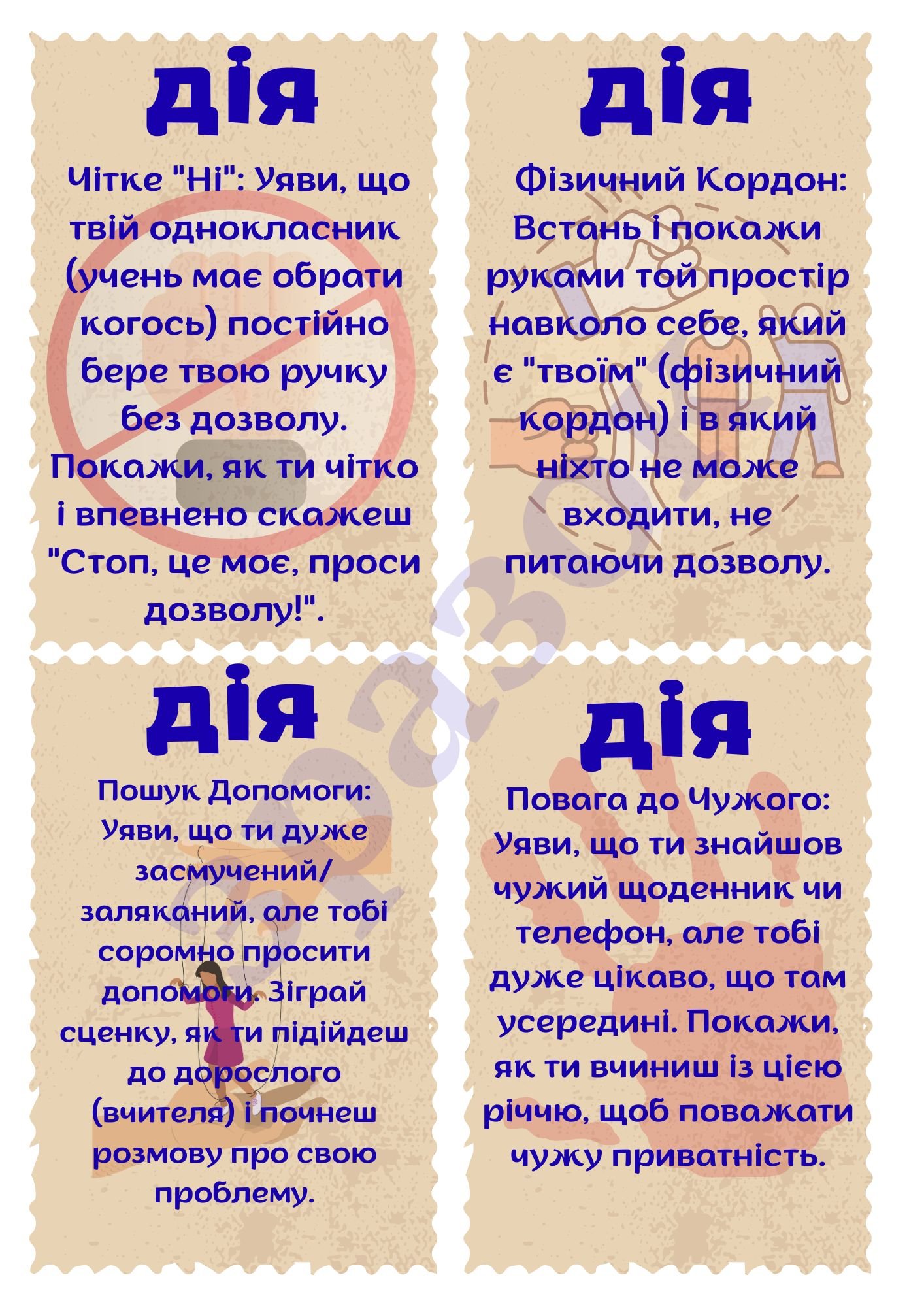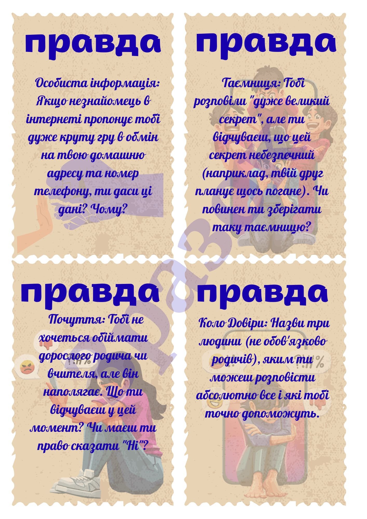 Інтерактивна гра “Правда чи Дія: кордони в реалії та кіберпросторі” дозволить вам гарно провести виховний захід для учнів 7-8-х класів. За допомогою ціє гри можна перевірити уже наявні зання учнів та можливість отримати нові за допомогою гри. Гра максимально проста, але піднімає важливі питання і вимагає обдуманих відповідей. Бонусом є 5 карток-підказок. Можна використати в рамках Всесвітньої акції “16 днів проти насильства”