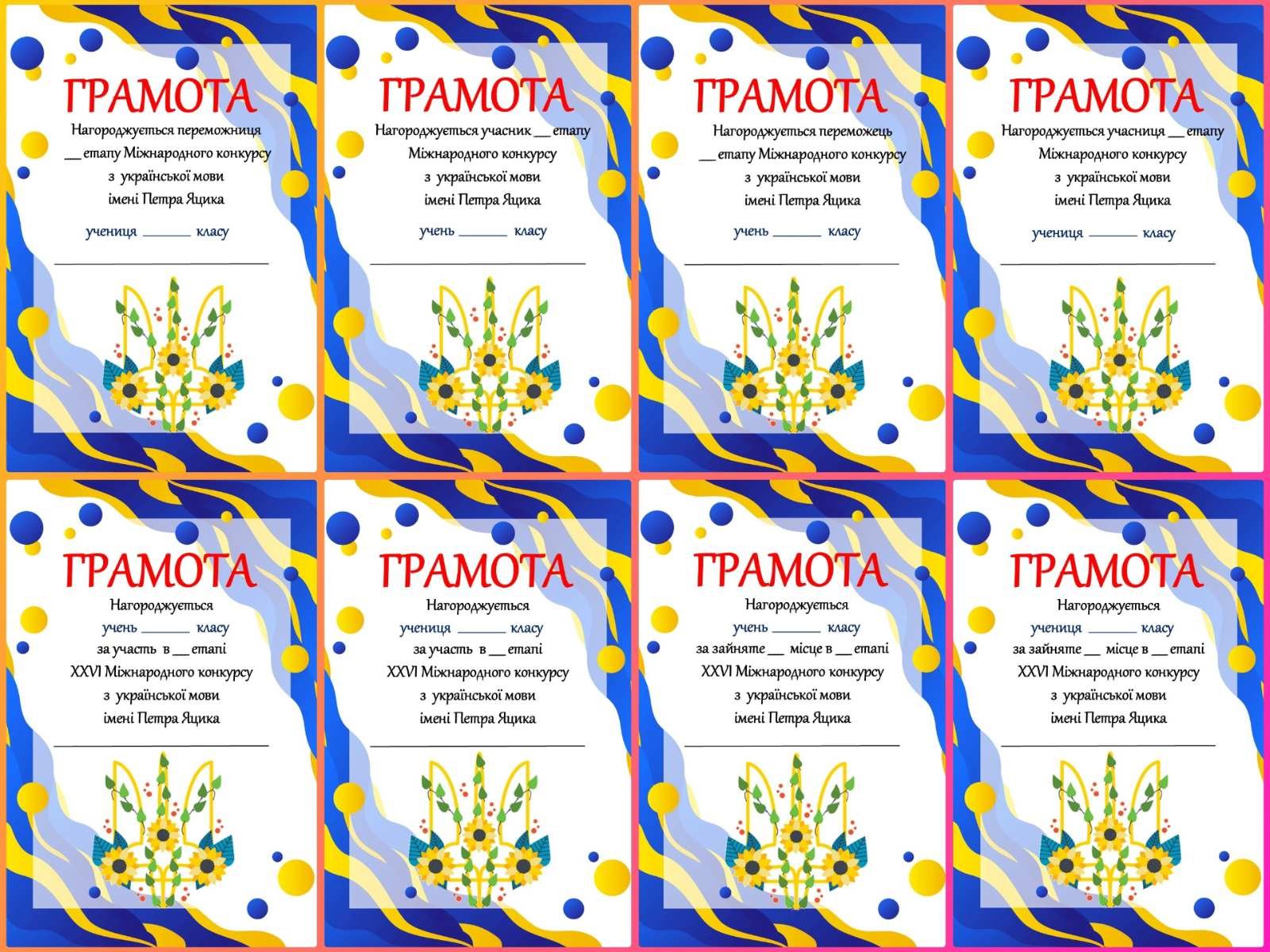 Є три варіанти оформлення, для учнів початкової школи та для учнів старшої школи. Грамоти для учасників та учасниць, для переможців та переможниць. Також є варіант де можна вписати яке місце зайняла дитина, та який це етап конкурсу.