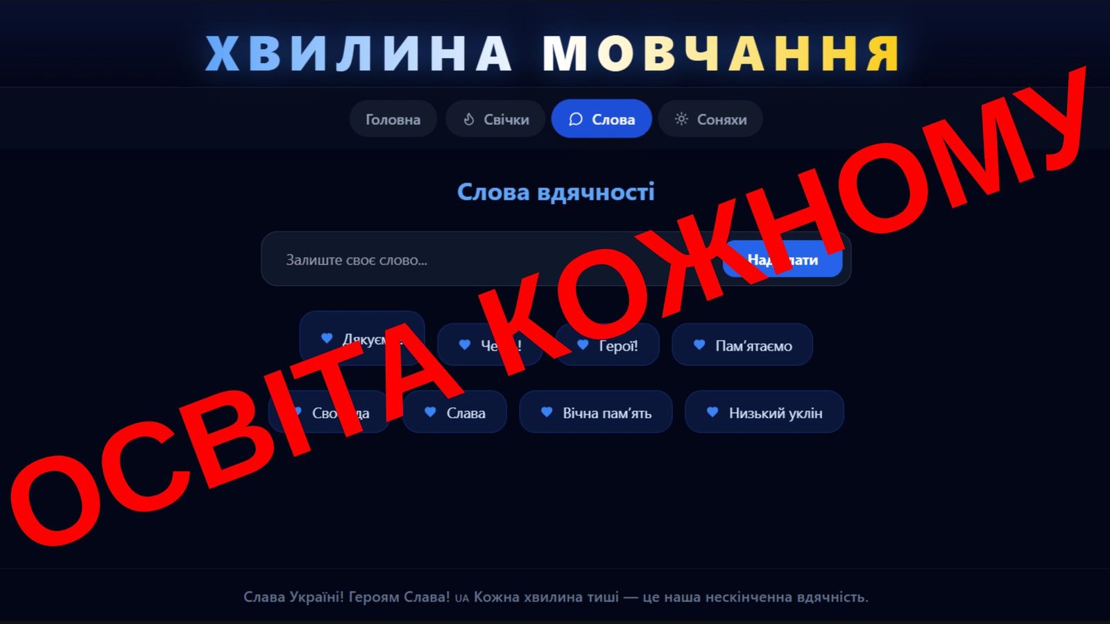 «Хвилина мовчання» – за допомогою таймера та метронома пропонується присвятити 60 секунд тиші для зосередженого вшанування пам’яті загиблих захисників та запалити свічку пам’яті;