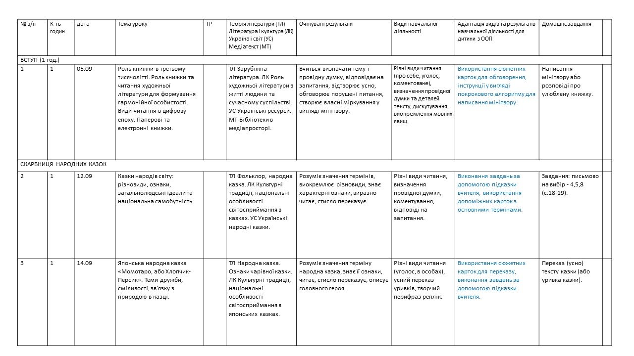Інклюзія. 5 клас НУШ Календарно-тематичне планування із зарубіжної літератури 5 кл НУШ для дітей ...