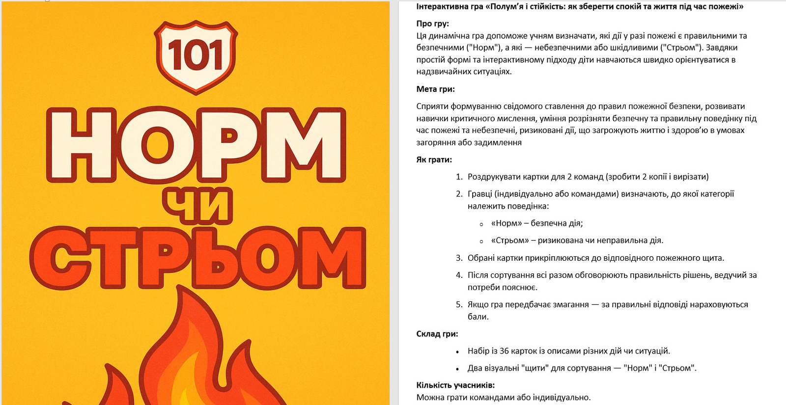 Інтерактивна дидактична гра НОРМ чи СТРЬОМ «Полум’я і стійкість: як зберегти спокій та життя під час пожежі» — це яскравий і сучасний освітній ресурс, створений для формування у дітей навичок безпечної поведінки під час пожежі. Гра спонукає дітей критично мислити, аналізувати ризики, обговорювати ситуації, що трапляються в реальному житті, й робити правильний вибір.