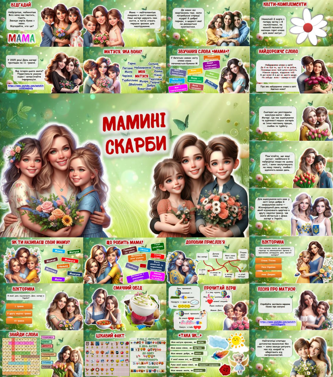Матеріали «Інтерактивна презентація: МАМИНІ СКАРБИ. День матері.» будуть надіслані в електронному вигляді на вашу поштову скриньку одразу після оплати.