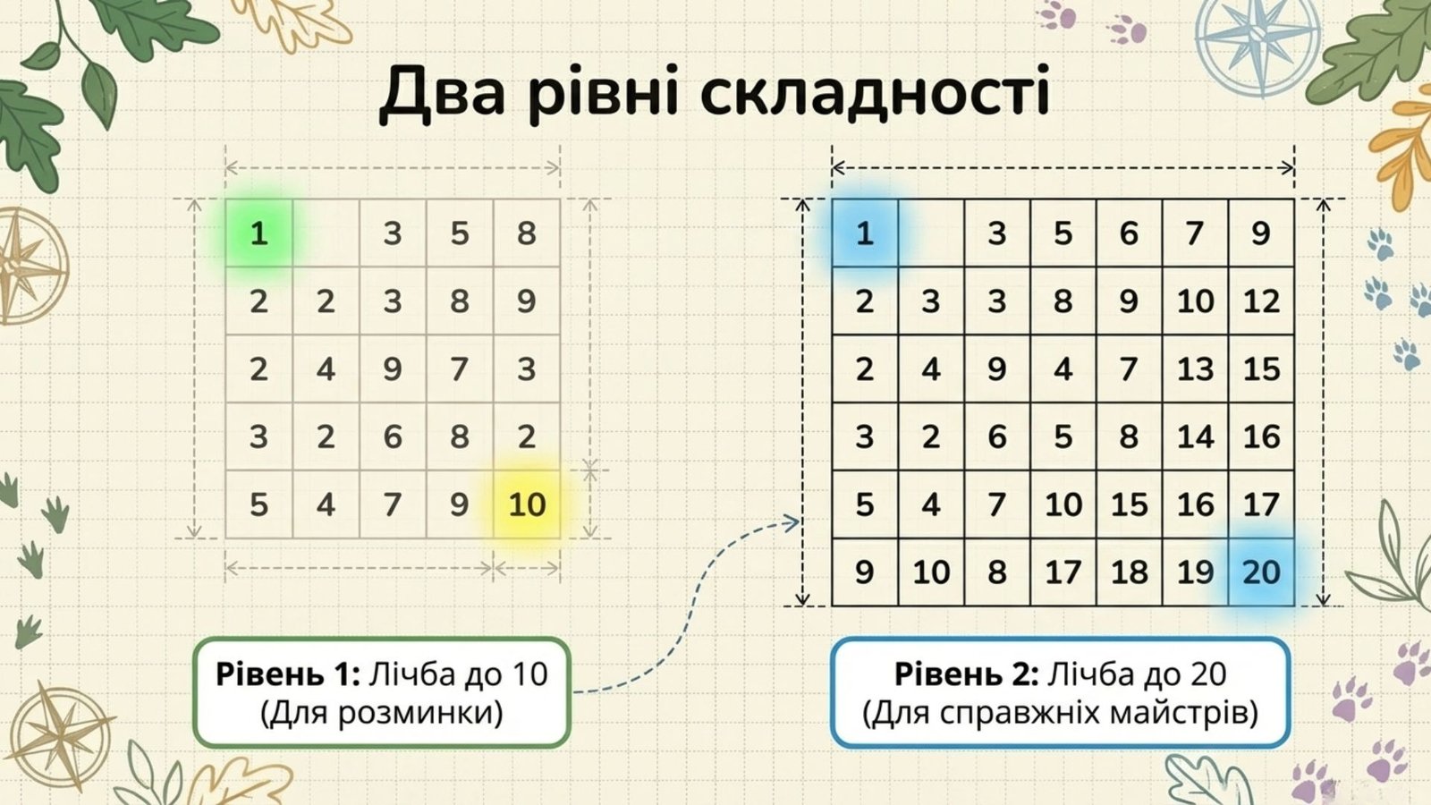 Багаторівневість навчання: Посібник містить два рівні складності — лічба від 1 до 10 та від 1 до 20. Це дозволяє вчителю використовувати один ресурс для дітей з різним рівнем підготовки, забезпечуючи індивідуальний підхід.
