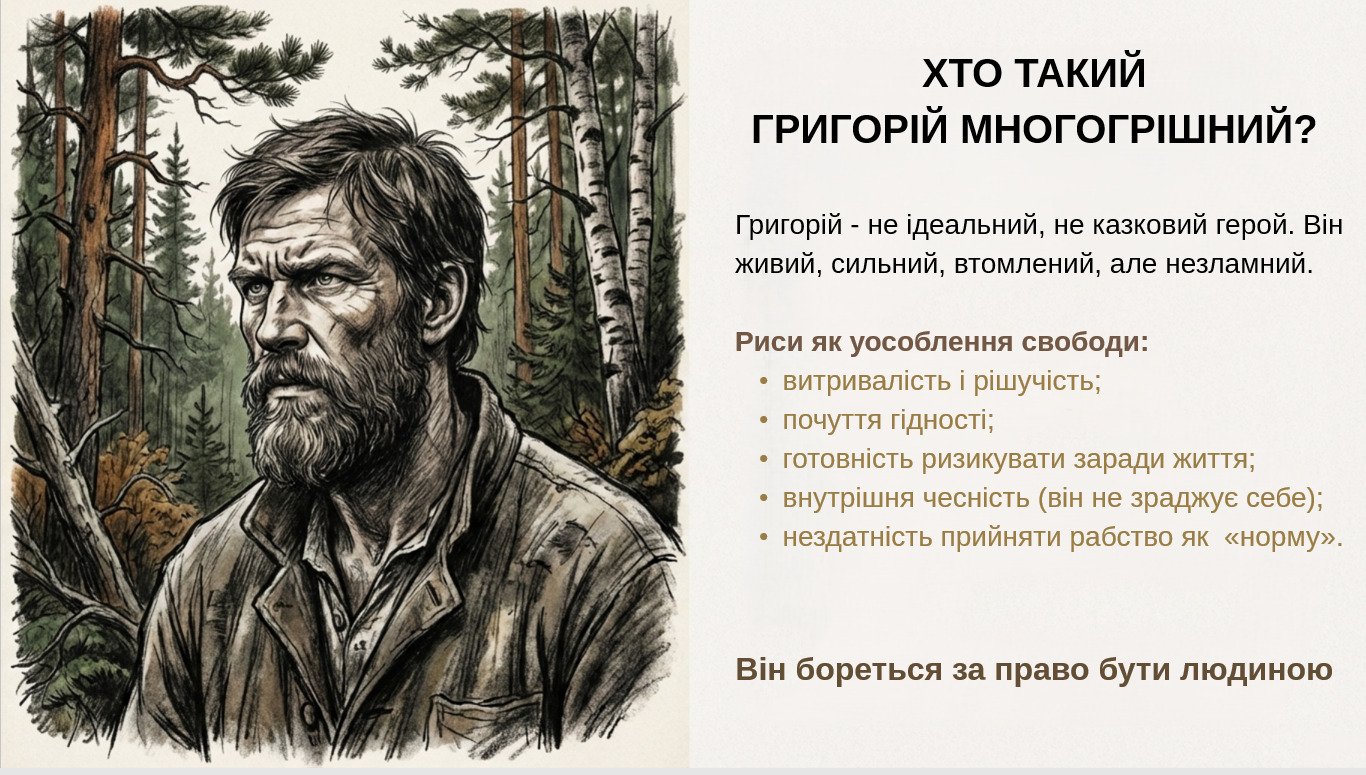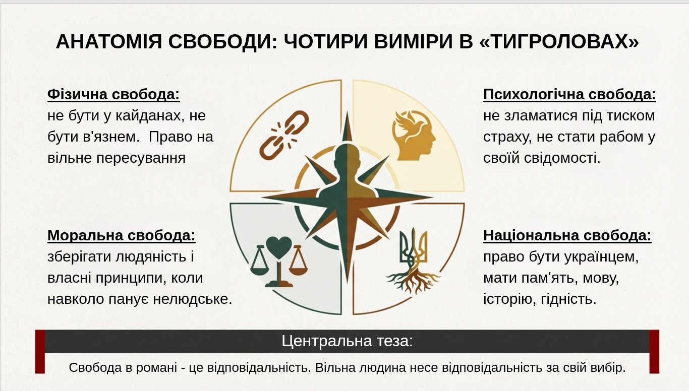 Готова навчальна презентація (18 слайдів) для уроку української літератури за романом Івана Багряного «Тигролови». Матеріал подає твір як пригодницький роман із глибокою ідеєю свободи: від втечі з «ешелону смерті» до внутрішнього вибору не скоритися системі. Презентація допомагає швидко й структуровано розкрити сюжетну динаміку, головних персонажів, символіку, “анатомію свободи” (4 виміри), тему боротьби людини з тоталітаризмом та актуальність роману сьогодні.