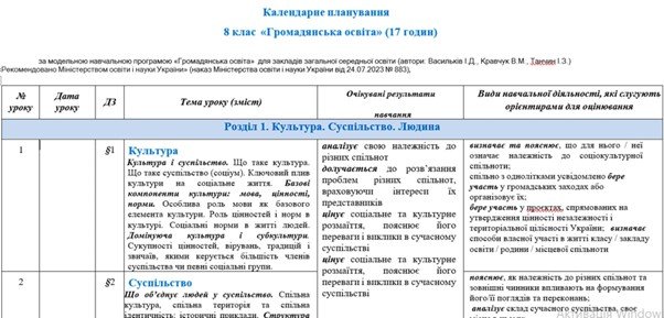 Календарне планування 8 клас «Громадянська освіта» (17 годин) за модельною навчальною програмою “Громадянська освіта” для закладів середньої освіти (автори: Васильків І.Д., Кравчук В.М., Танчин І.З)