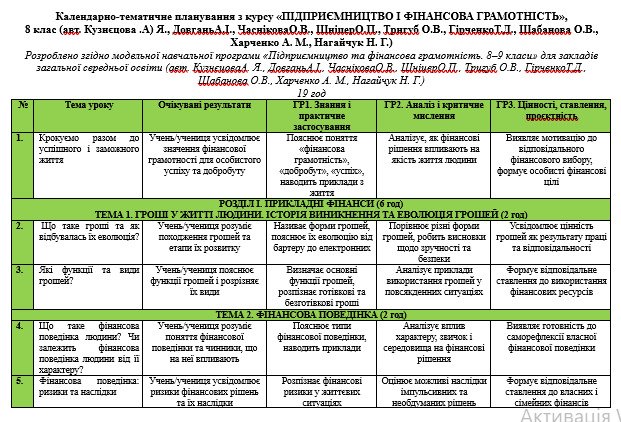 Календарно-тематичне планування з курсу «ПІДПРИЄМНИЦТВО І ФІНАНСОВА ГРАМОТНІСТЬ», 8 клас (авт. Кузнєцова .А)