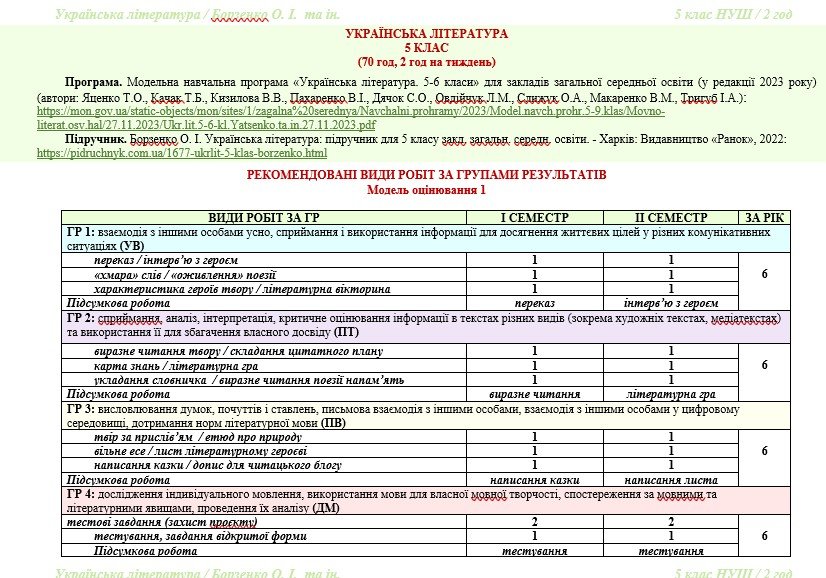 Коли я отримаю матеріал «Календарне планування з ГР. Українська література. 5 клас НУШ. Борзенко О. І. (70 год / 2 год на тиждень). Модель оцінювання 1»?