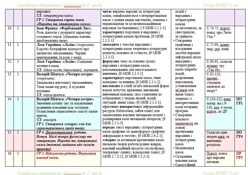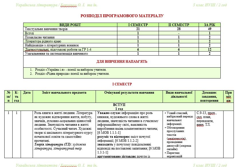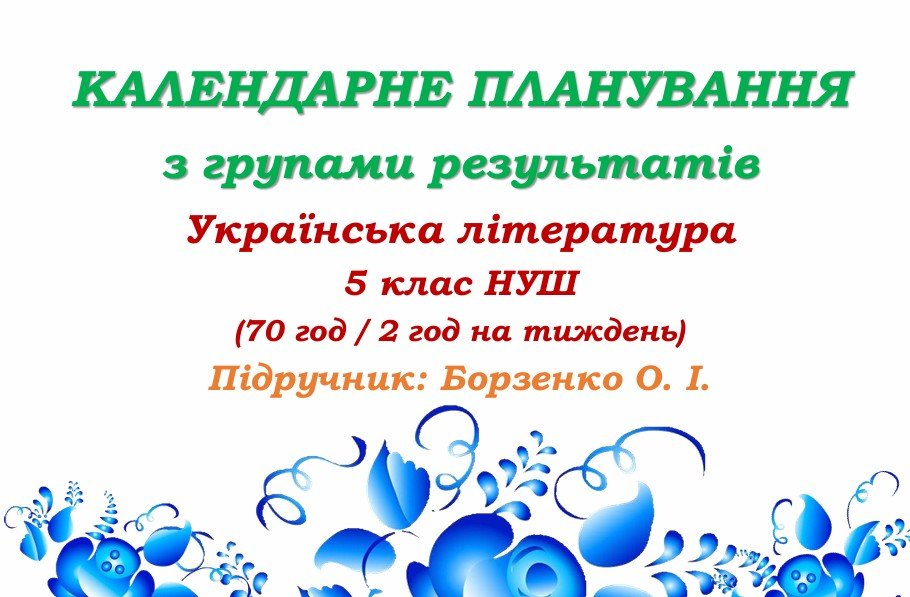 Календарно-тематичне планування з української літератури розроблено на основі модельної навчальної програми «Українська література. 5-6 класи» для закладів загальної середньої освіти (автори: Яценко Т.О., Качак Т.Б., Кизилова В.В., Пахаренко В.І., Дячок С.О., Овдійчук Л.М., Слижук О.А., Макаренко В.М., Тригуб І.А.) та підручника «Українська література. 5 клас» (автор: Борзеноко О. І. Українська література: підручник для 5 класу закл. загальн. середн. освіти. – Харків: Видавництво “Ранок”, 2022).