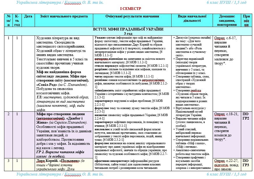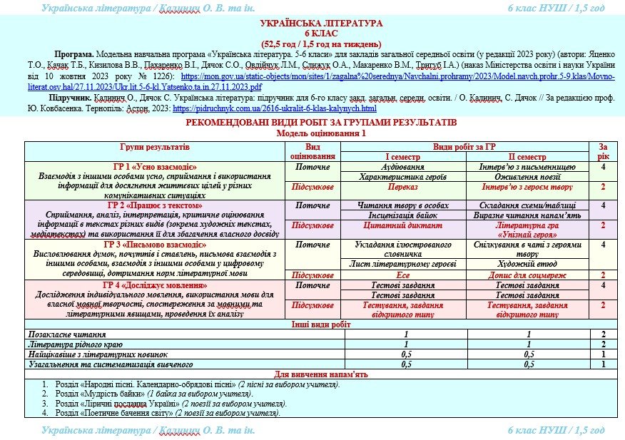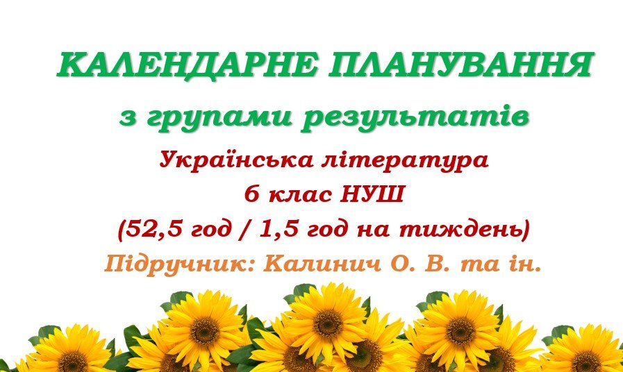 Календарно-тематичне планування з української літератури розроблено на основі модельної навчальної програми «Українська література. 5-6 класи» для закладів загальної середньої освіти (автори: Яценко Т.О., Качак Т.Б., Кизилова В.В., Пахаренко В.І., Дячок С.О., Овдійчук Л.М., Слижук О.А., Макаренко В.М., Тригуб І.А.) та підручника «Українська література. 6 клас» (автори: Калинич О., Дячок С. Українська література: підручник для 6 класу закл. загальн. середн. освіти. / О. Калинич, C. Дячок // За редакцією проф. Ю. Ковбасенка. – Тернопіль: Астон, 2023).