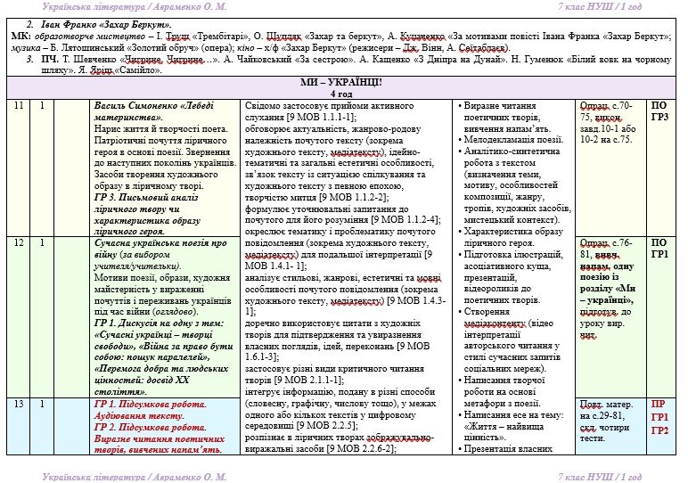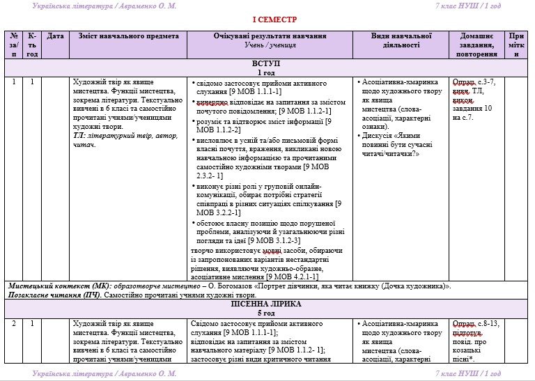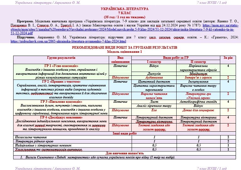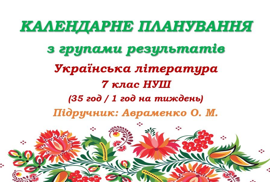 Календарно-тематичне планування з української літератури розроблено на основі модельної навчальної програми «Українська література. 7-9 класи» для закладів загальної середньої освіти (автори: Яценко Т. О., Пахаренко В. І., Слижук О. А., Тригуб І. А. ), рекомендованої Міністерством освіти і науки України» (наказ від 24.12.2024 року № 1787), та підручника «Українська література. 7 клас» (автор: Авраменко О. М. Українська література: підручник для 7 класу закл. загальн. середн. освіти. – К.: «Грамота», 2024).