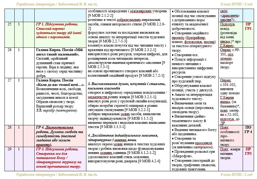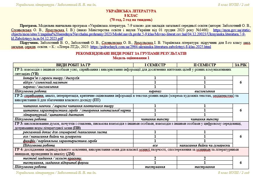 Календарно-тематичне планування з української літератури розроблено на основі модельної навчальної програми «Українська література. 7-9 класи» для закладів загальної середньої освіти (автори: Заболотний О. В., Слоньовська О. В., Ярмульська І. В.) та підручника «Українська література. 8 клас» (автори: Заболотний В. В., Заболотний О. В., Слоньовська О. В., Ярмульська І. В. Українська література: підручник для 8-го класу закл. загальн. середн. освіти. – К.: «Літера ЛТД», 2025).