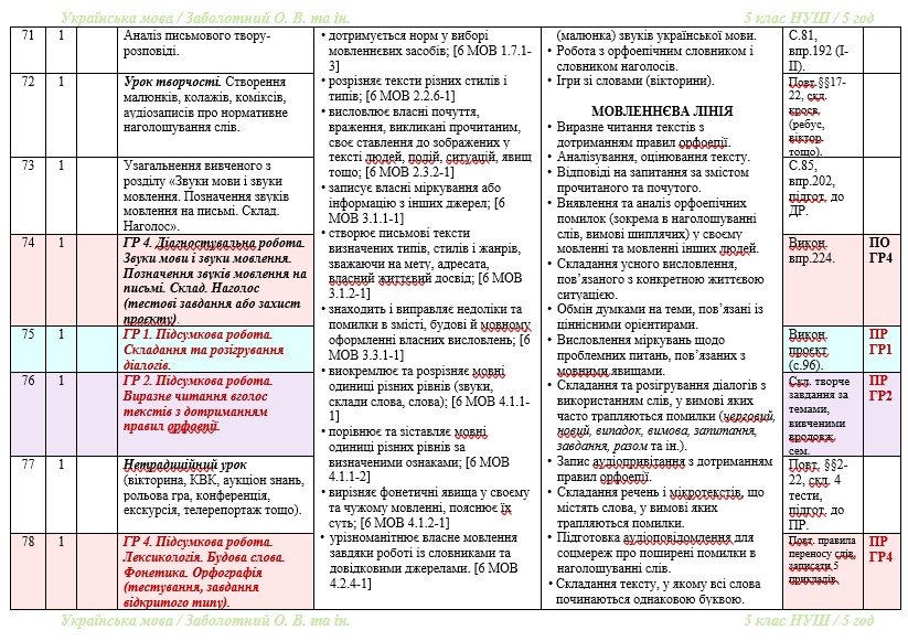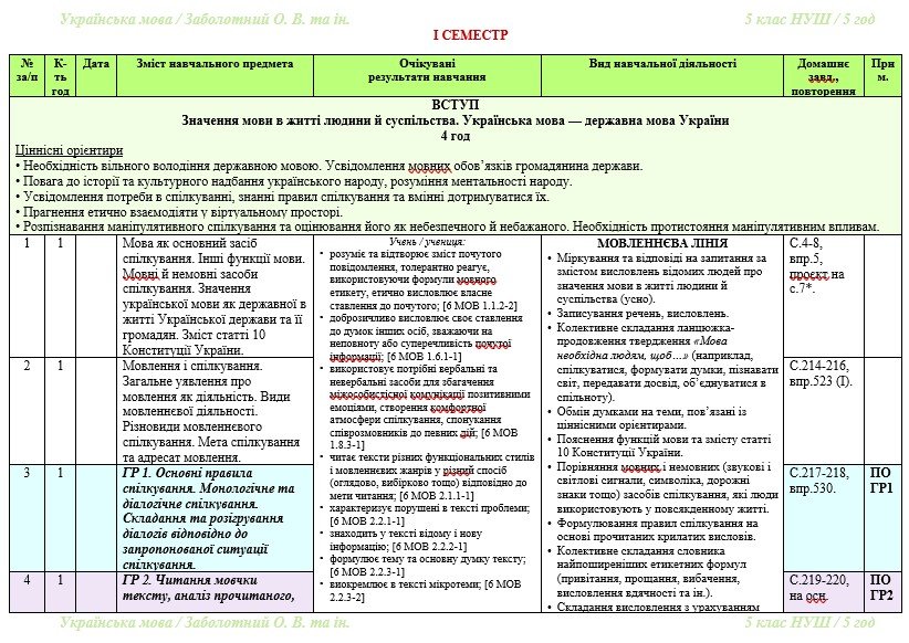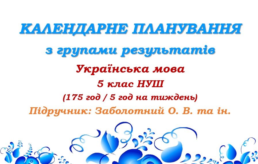 Календарно-тематичне планування з української мови розроблено на основі модельної навчальної програми «Українська мова. 5-6 класи» для закладів загальної середньої освіти (автори: Заболотний О. В., Заболотний В. В., Лавринчук В. П., Плівачук К. В., Попова Т. Д.) та підручника «Українська мова. 5 клас» (автори: Заболотний О. В., Заболотний В. В. Українська мова: підручник для 5 класу закл. загальн. середн. освіти. – К.: «Генеза», 2022).