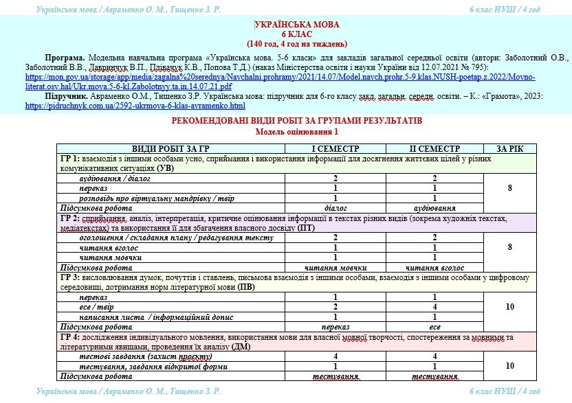 КАЛЕНДАРНЕ ПЛАНУВАННЯ(І модель оцінювання) із ГР. Українська мова 8 кл. НУШ.АВРАМЕНКО О. М., ТИЩЕ...