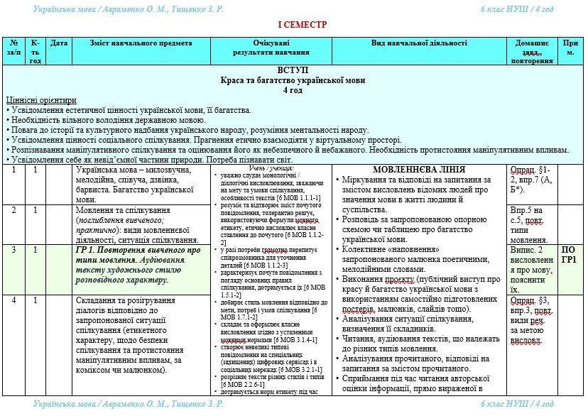 КАЛЕНДАРНЕ ПЛАНУВАННЯ(І модель оцінювання)із ГР. Українська мова 8 кл. НУШ.АВРАМЕНКО О. М., ТИЩЕН...