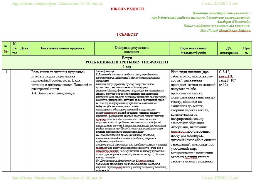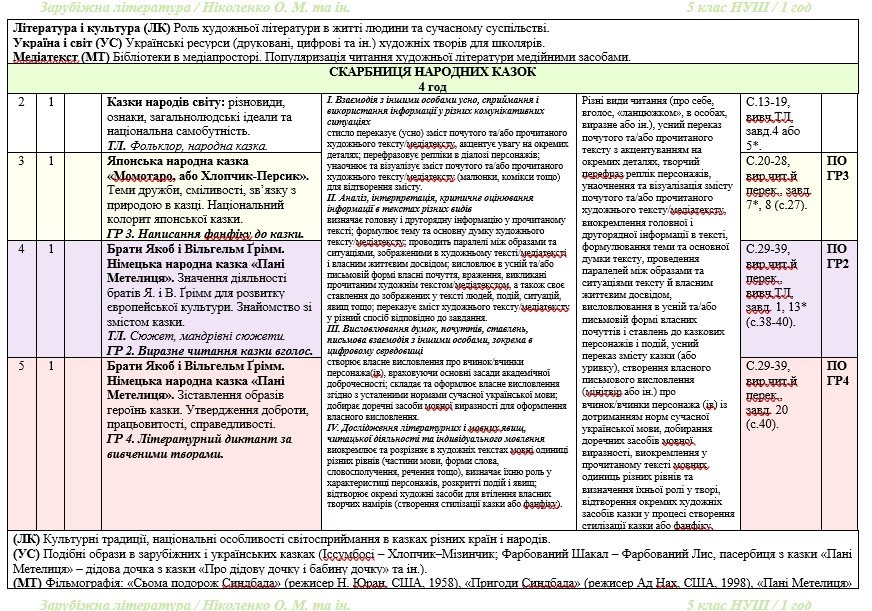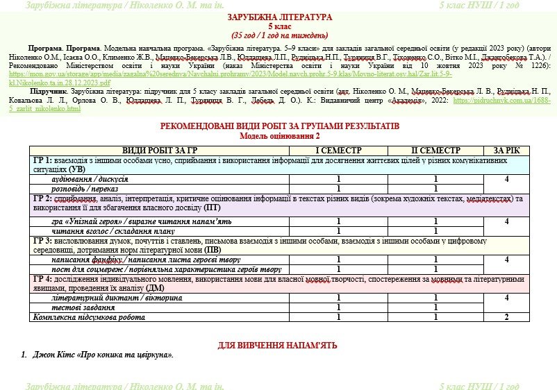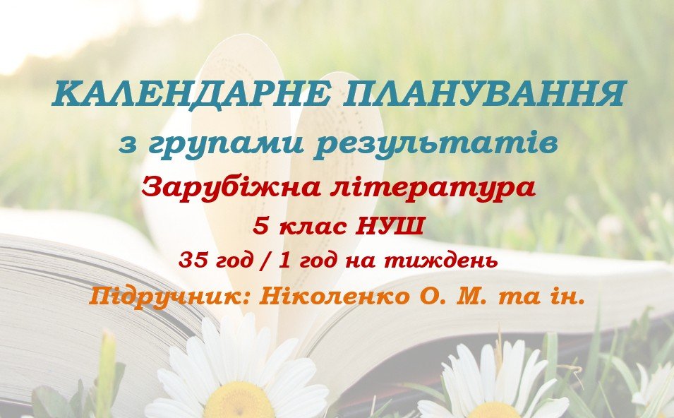 Календарне планування з ГР. Зарубіжна література. 5 клас НУШ. Ніколенко О. М. та ін. (35 год / 1 год на тиждень). Модель оцінювання 2