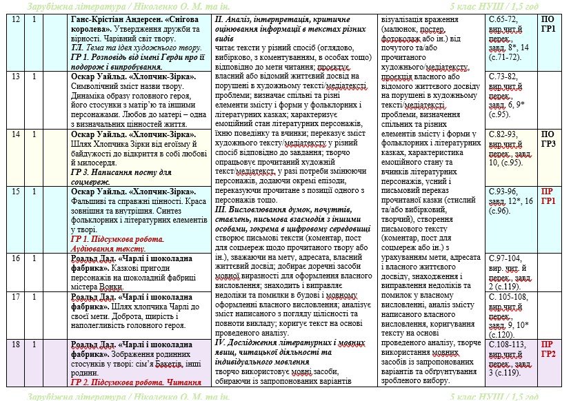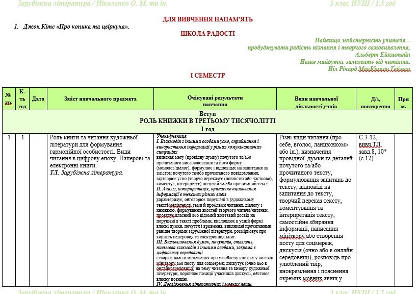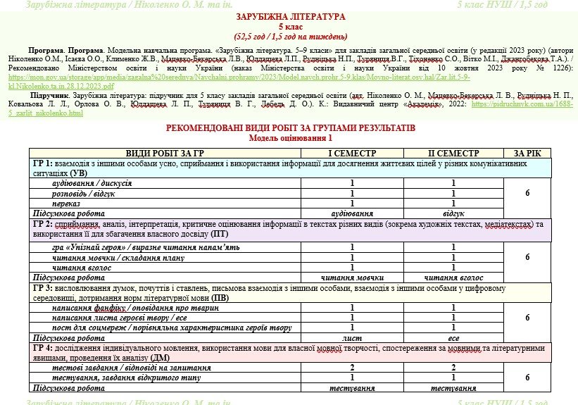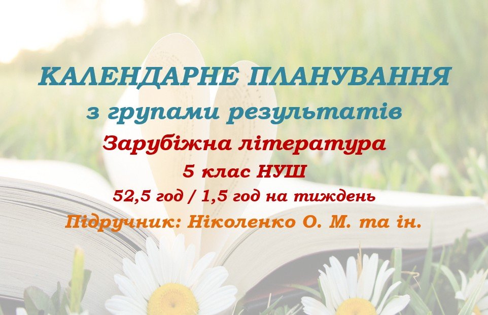 Календарне планування з ГР. Зарубіжна література. 5 клас НУШ. Ніколенко О. М. та ін. (52,5 год / 1,5 год на тиждень). Модель оцінювання 1