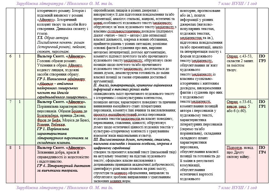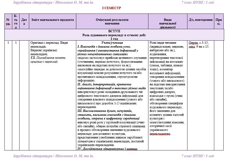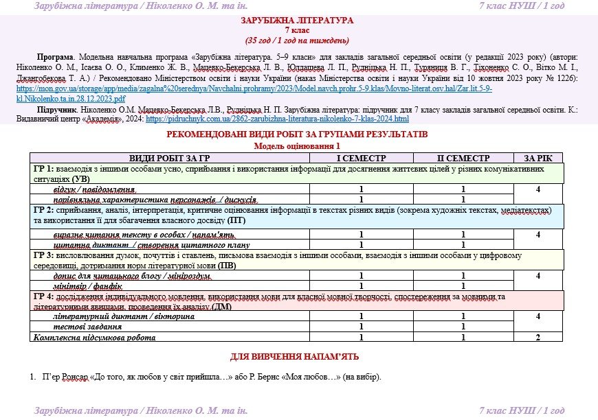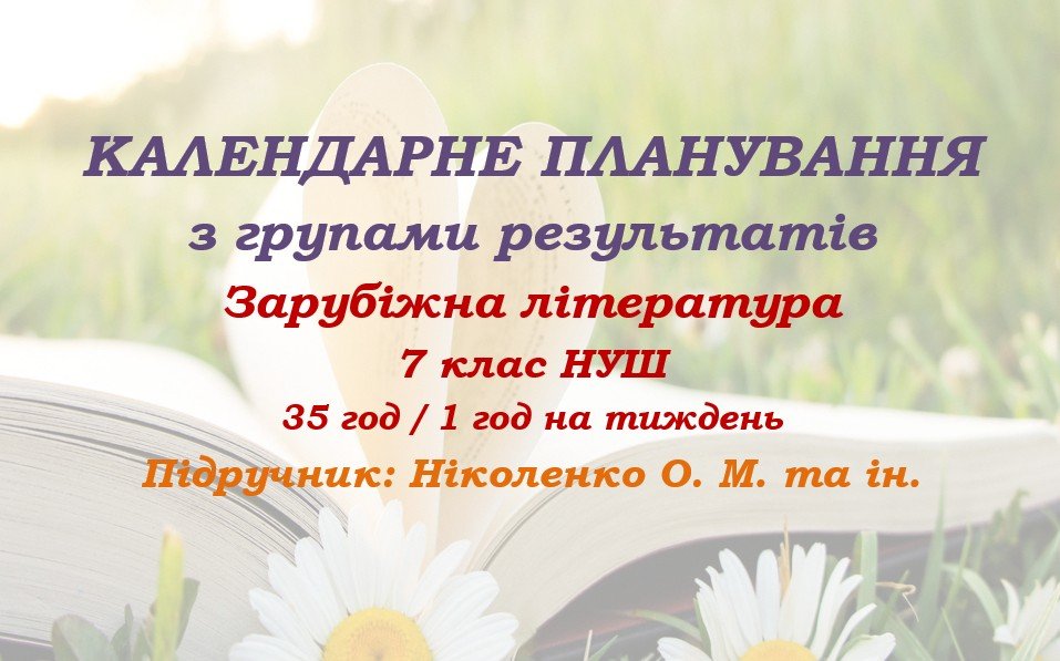 Календарне планування з ГР. Зарубіжна література. 7 клас НУШ. Ніколенко О. М. та ін. (35 год / 1 год на тиждень). Модель оцінювання 2