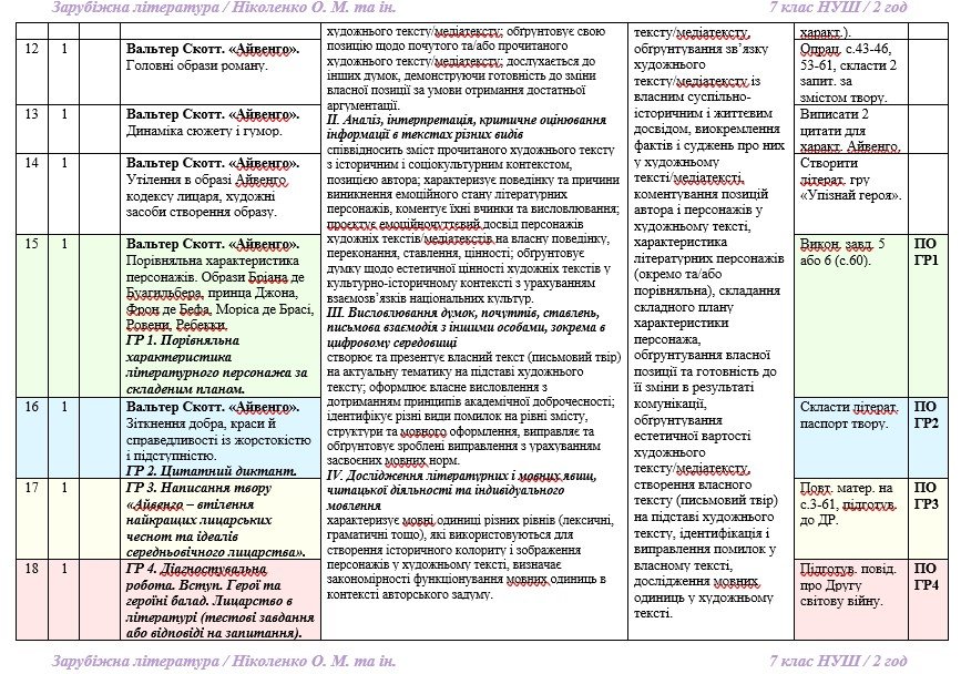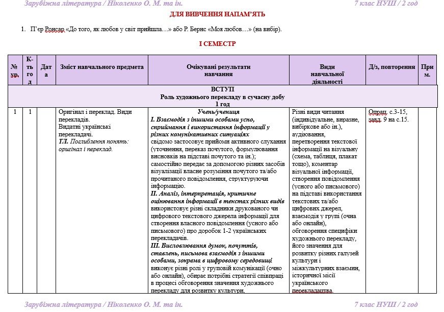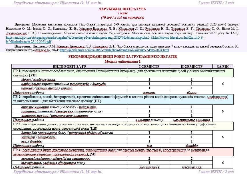 Календарне планування з ГР. Зарубіжна література. 7 клас НУШ. Ніколенко О. М. та ін. (70 год / 2 год на тиждень). Модель оцінювання 1