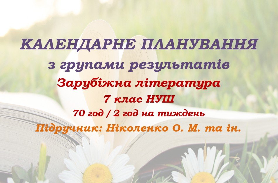Головне зображення розробки: Календарне планування з ГР. Зарубіжна література. 7 клас НУШ. Ніколенко О. М. та ін. (70 год / 2 год на тиждень). Модель оцінювання 1