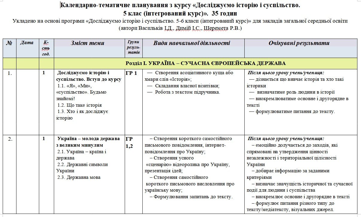 Календарно-тематичне планування Досліджуємо історію і суспільство. 5 клас. 35 годин. З групами результатів. За підручником і модельною програмою Васи