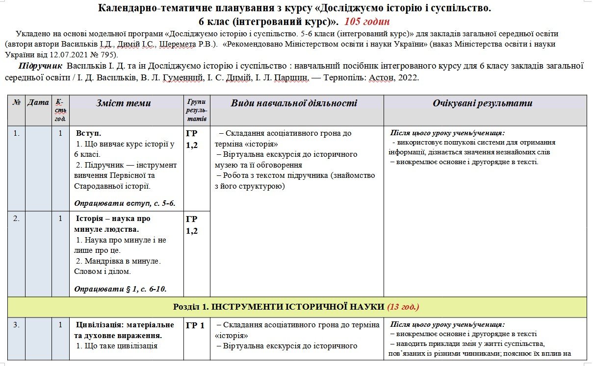Календарно-тематичне планування «Досліджуємо історію і суспільство”. 6 клас. 105 годин. З групами результатів. За підручником і модельною програмою Ва