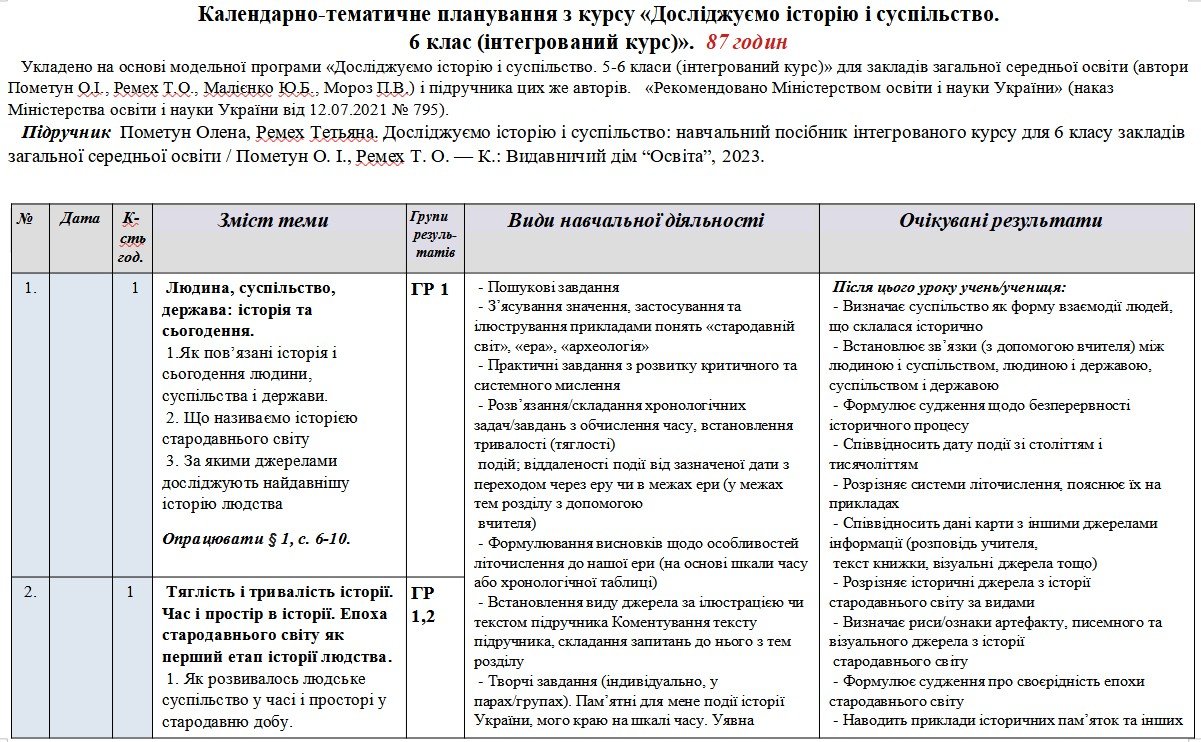 Календарно-тематичне планування «Досліджуємо історію і суспільство”. 6 клас. 87 годин. З групами результатів. За підручником та модельною програмою По