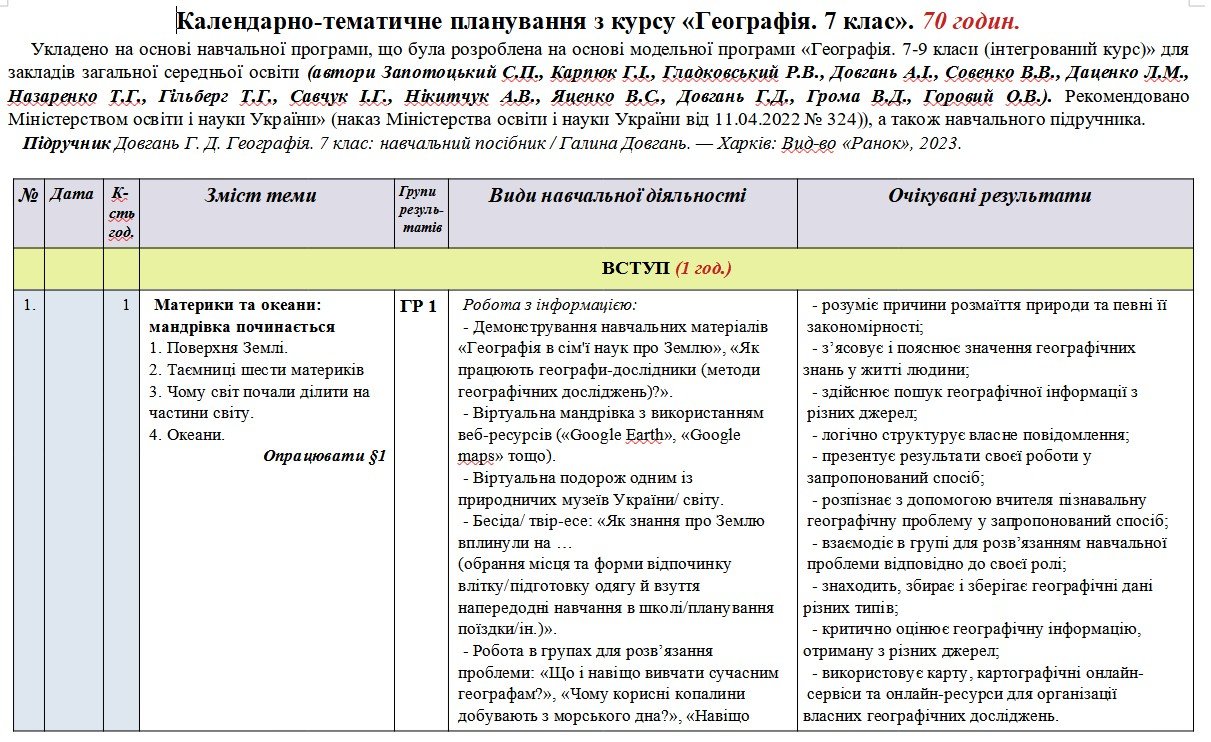 Календарно-тематичне планування «Географія”. 7 клас. 70 годин. З групами результатів. За пі...
