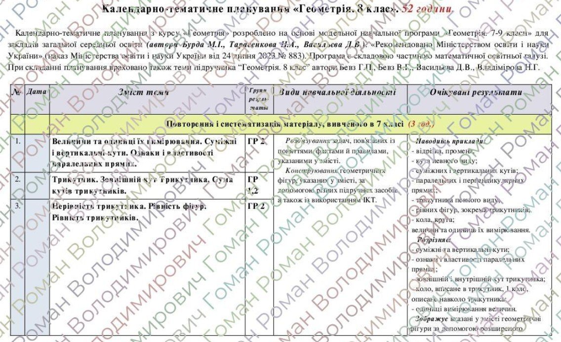 Як купити матеріал «Календарно-тематичне планування «Геометрія”. 8 клас. 52 год. З групами результатів. НУШ. За модельною програмою Бурда М., Тарасенкова Н. і підручником»?