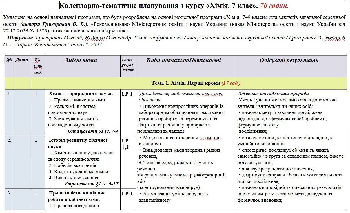 Календарно-тематичне планування «Хімія”. 7 клас. 70 годин. З групами результатів. За підручником Григорович О. та модельною програмою Григорович О.