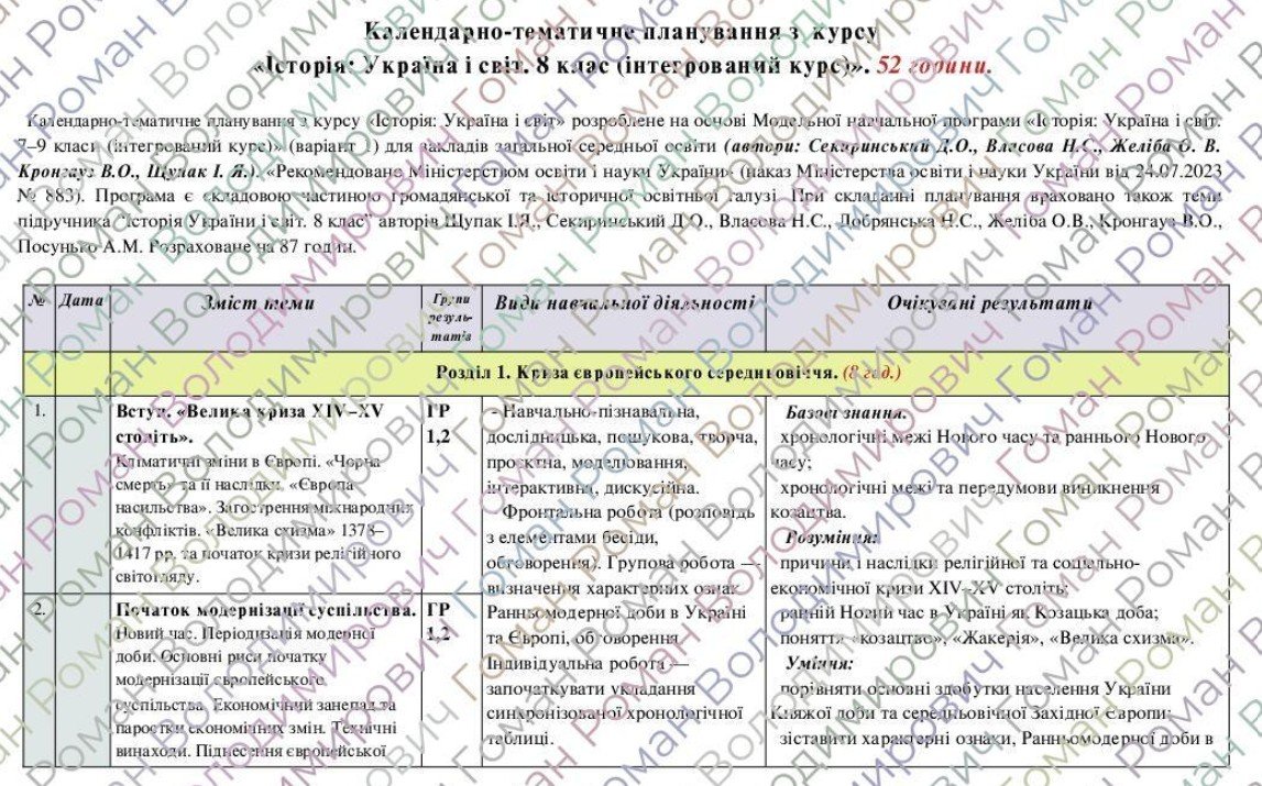 Календарно-тематичне планування «Історія: Україна і світ. 8 клас». 52 год. З групами результатів. До підручника Щупак І., Секиринський Д. і модельної