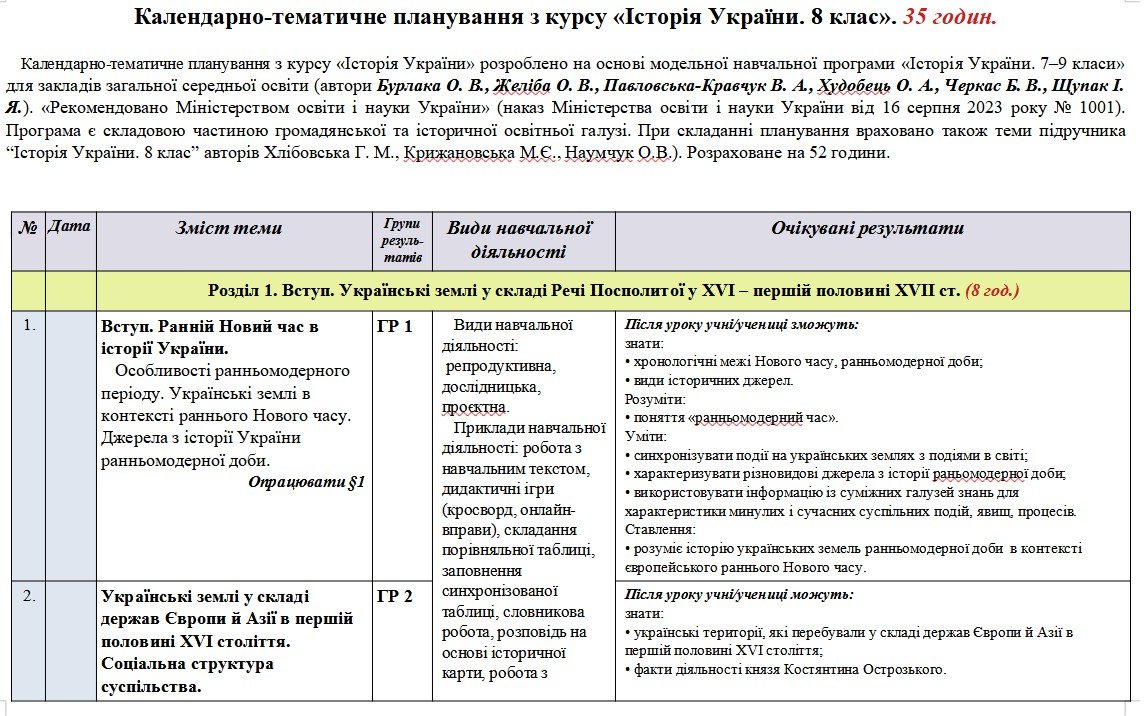 Календарно-тематичне планування «Історія України. 8 клас». 35 год. З групами результатів. До підручника Хлібовська Г. і модельної програми Бурлака О.,