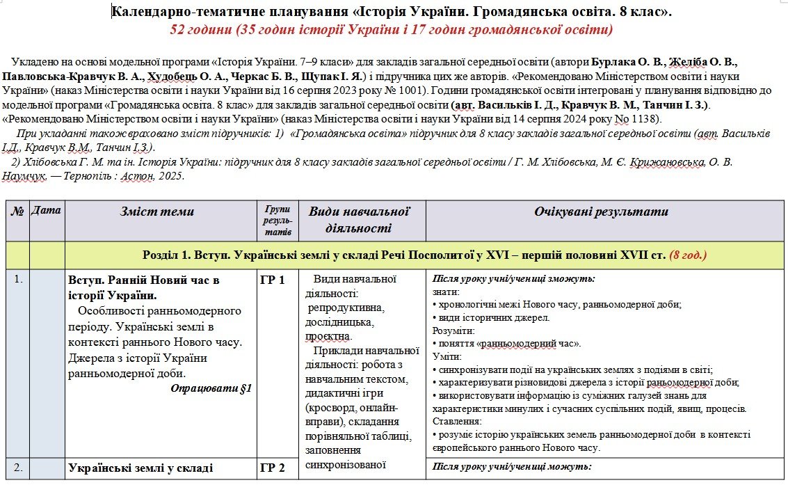 Календарно-тематичне планування «Історія України. Громадянська освіта. 8 клас». 52 години. З групами результатів. До підручників Хлібовська Г. (35 год