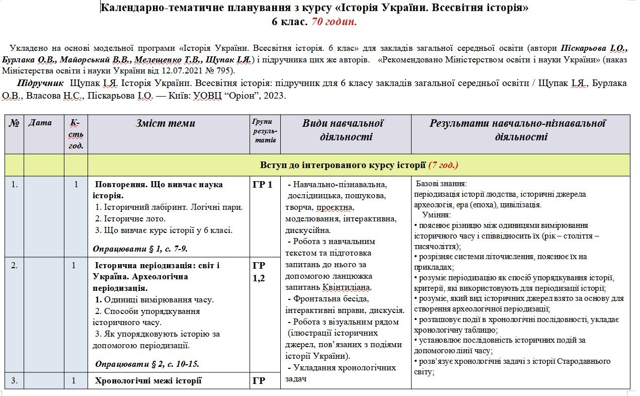 Календарно- тематичне планування з оцінюванням за групами результатів з курсу “Історія України.Вс...