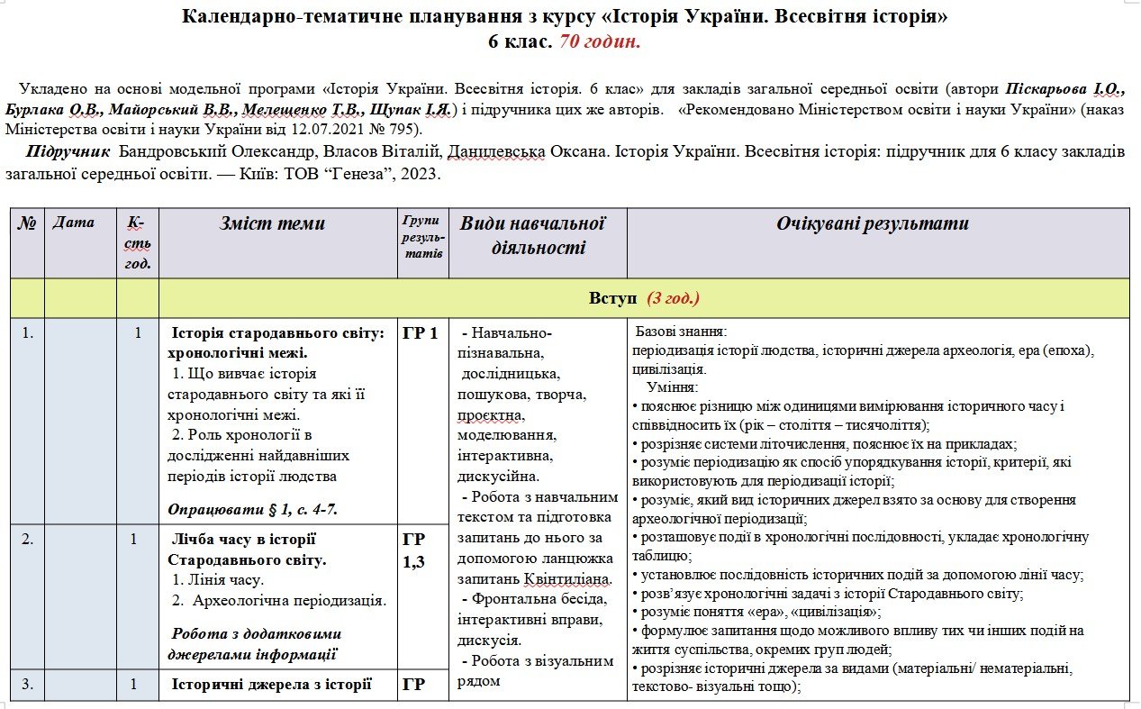 Календарно-тематичне планування «Історія України. Всесвітня історія”. 6 клас. 70 годин. З групами результатів. За підручником О. Бандровський та модел