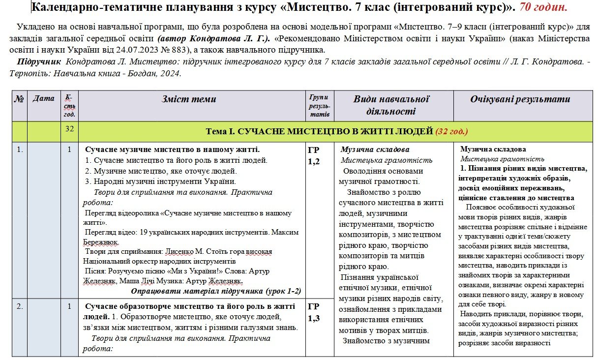 Календарно-тематичне планування «Мистецтво”. 7 клас. 70 годин. З групами результатів. За підручником Кондратова Л. та модельною програмою автора Кондр