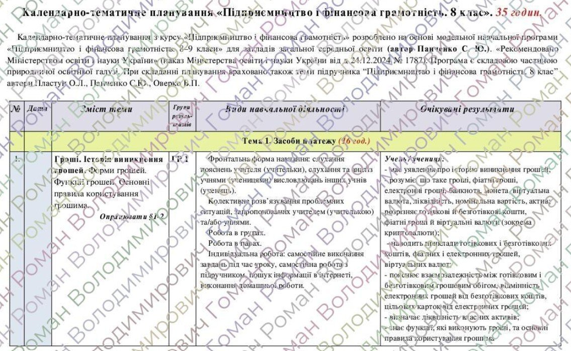 Календарно-тематичне планування «Підприємництво і фінансова грамотність. 8 клас». 35 год. До підручника Пластун О. і модельної програми Панченко С. та