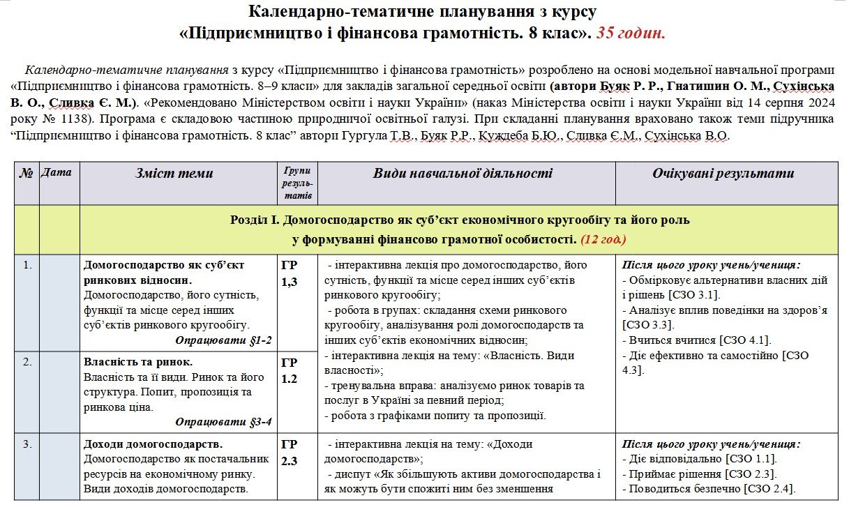 Календарно-тематичне планування «Підприємництво і фінансова грамотність. 8 клас». 35 год. З групами результатів. До підручника Гургула Т., Буяк Р. та