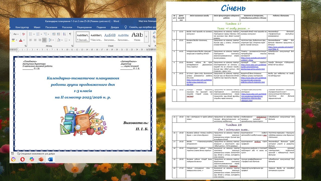 Календарно-тематичне планування роботи групи продовженого дня для 1-3 класів на 2 семестр 2024-2025