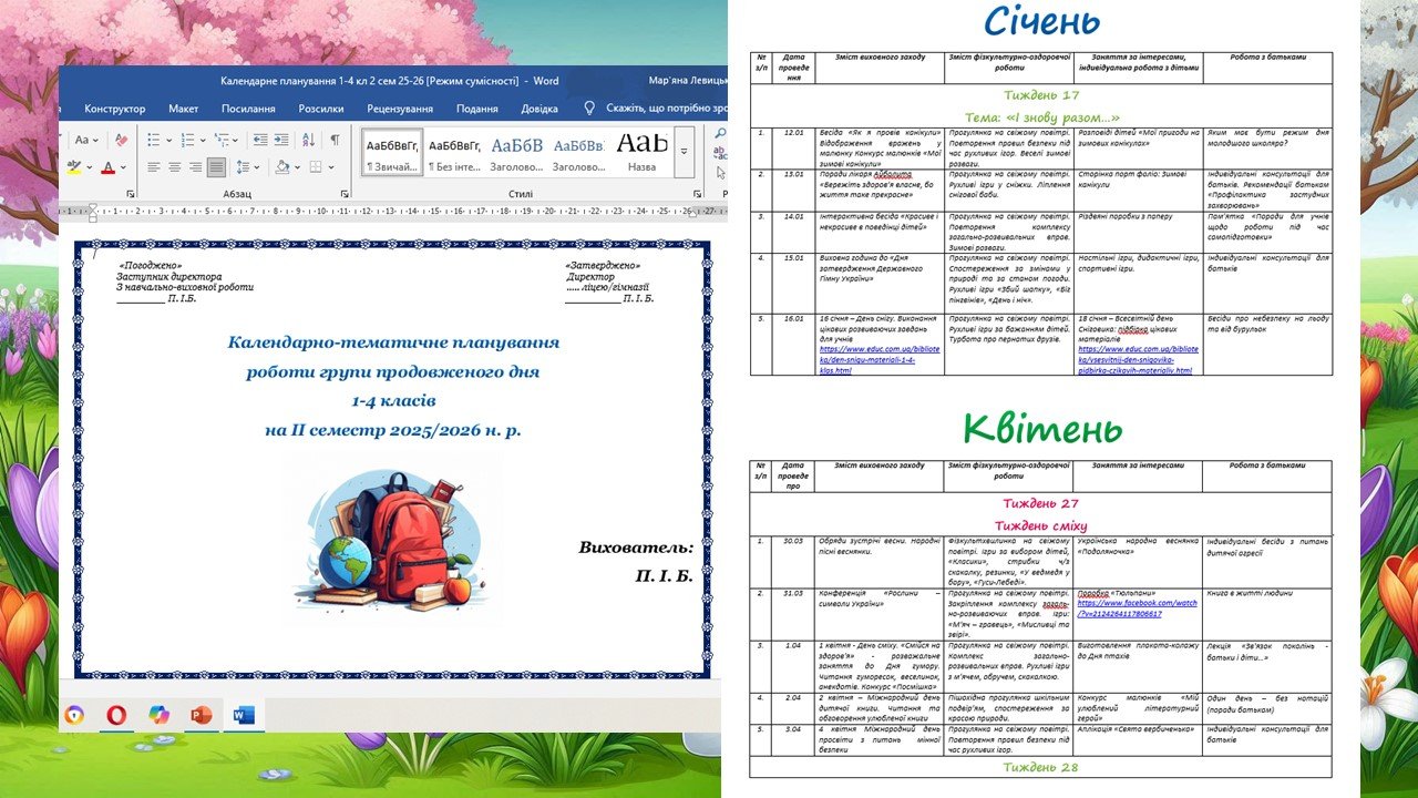 Календарно-тематичне планування роботи групи продовженого дня для 1-3 класів на 2 семестр 2024-2025