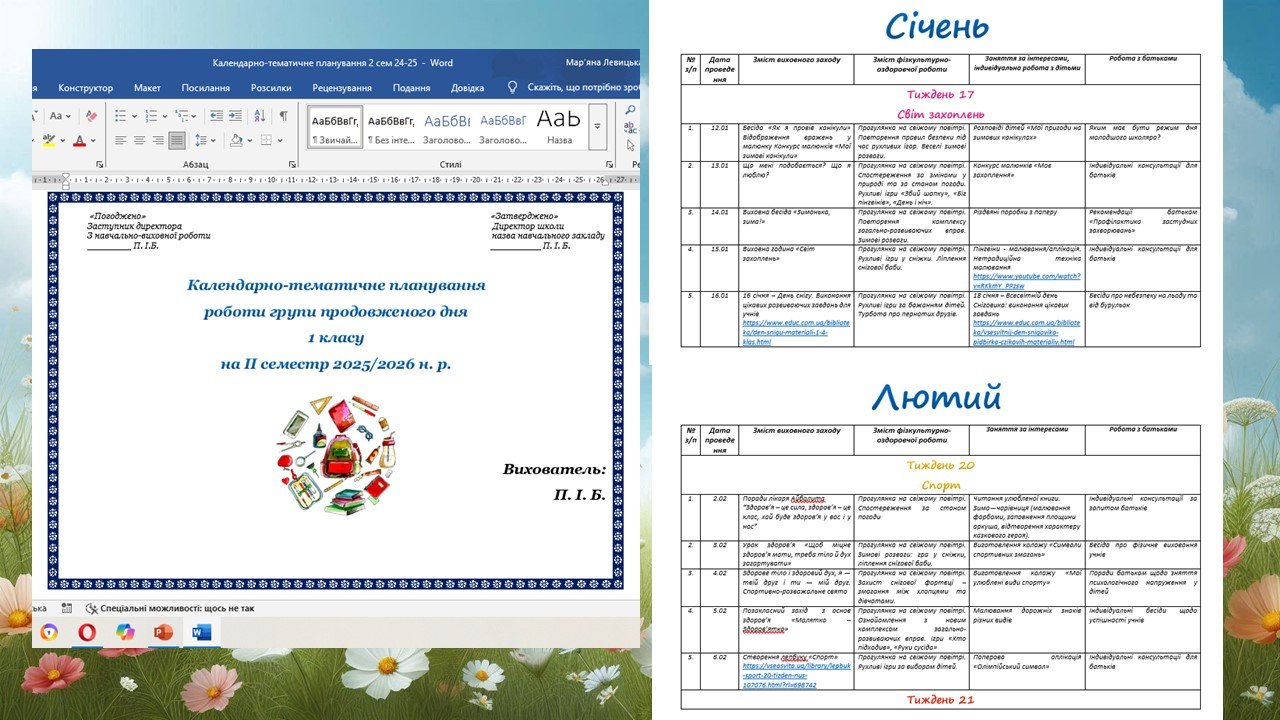 Календарно-тематичне планування роботи групи продовженого дня для 1-3 класів на 2 семестр 2024-2025
