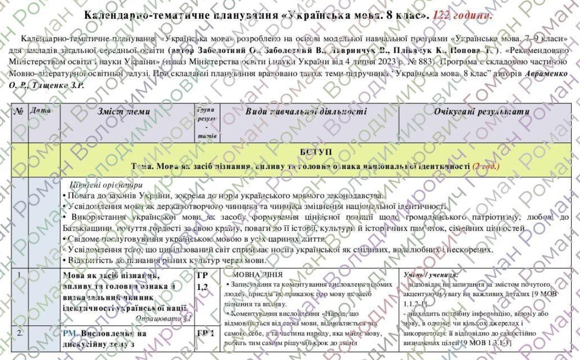 Календарно-тематичне планування “Українська мова”. 8 клас. 122 години. З групами результатів. НУШ. Розроблено на базі підручника Авраменко О. та модел
