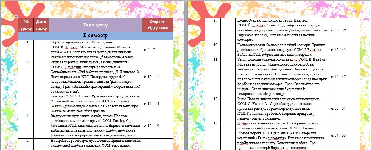 Календарно- тематичне планування з образотворчого мистецтва за програмою Савченко О.Я. на 2025-26...