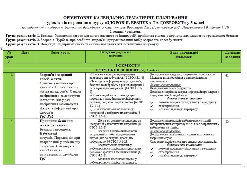 Календарно-тематичне планування З ГРУПАМИ РЕЗУЛЬТАТІВ для 5 класу з інтегрованого курсу “Зд...