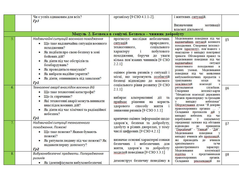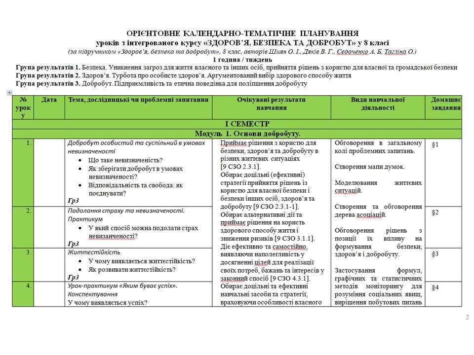 Календарно-тематичне планування “Здоров’я, безпека та добробут. 8 клас” НУШ, до...