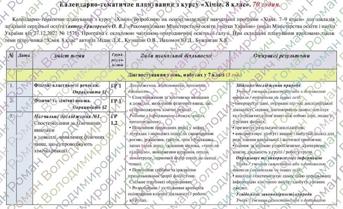 Як купити матеріал «Календарно-тематичне планування з Хімії. 8 клас. 70 годин. З групами результатів. НУШ. За підручником Мідак Л. та модельною програмою автора Григорови»?